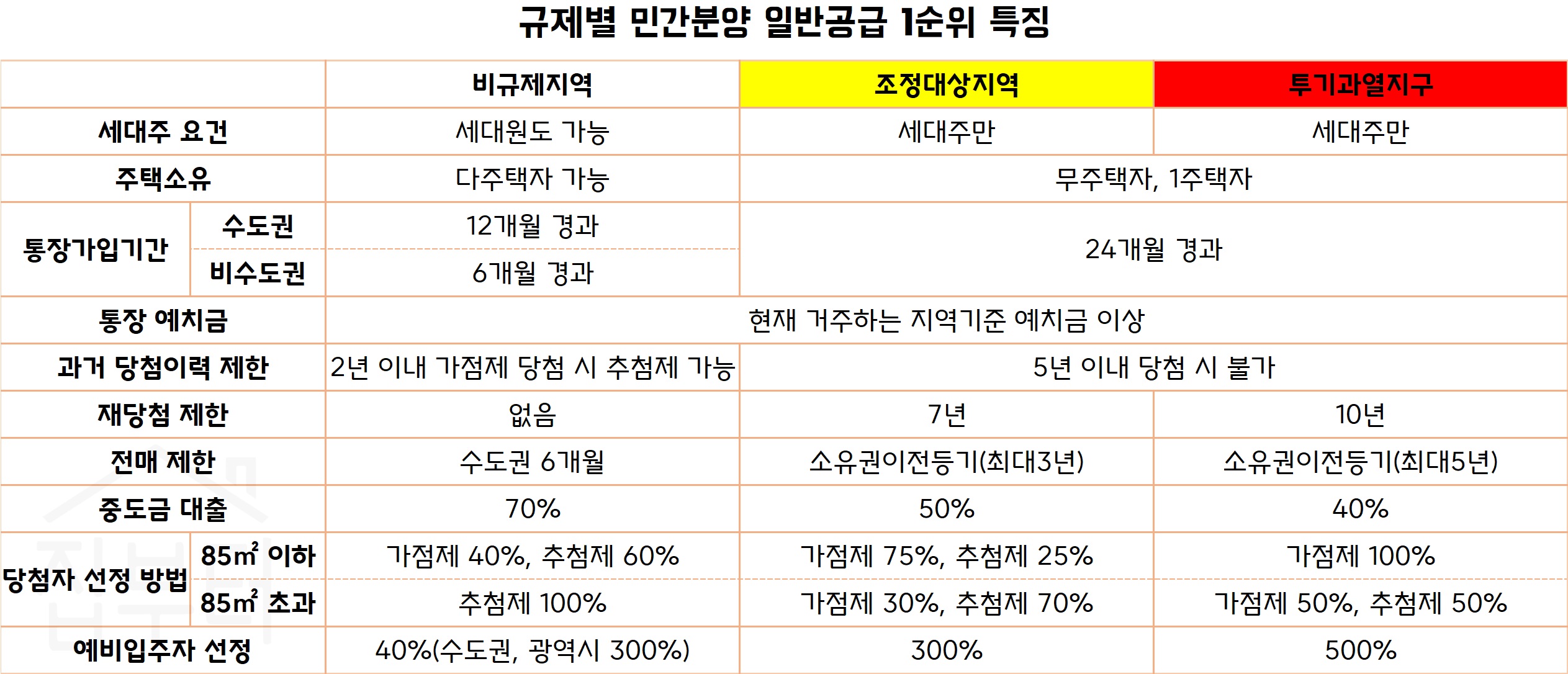 규제지역별 민간분양 일반공급을 비교해보았습니다. 가장 중요한 점은 내가 접수할 주택의 모집공고문을 꼼꼼하게 보셔야합니다. 같은 지역의 최근 분양한 곳의 공고문과 다른 점이 있을 수도 있습니다. 공고문이 가장 중요한 기준이라는 점 잊지 마세요!