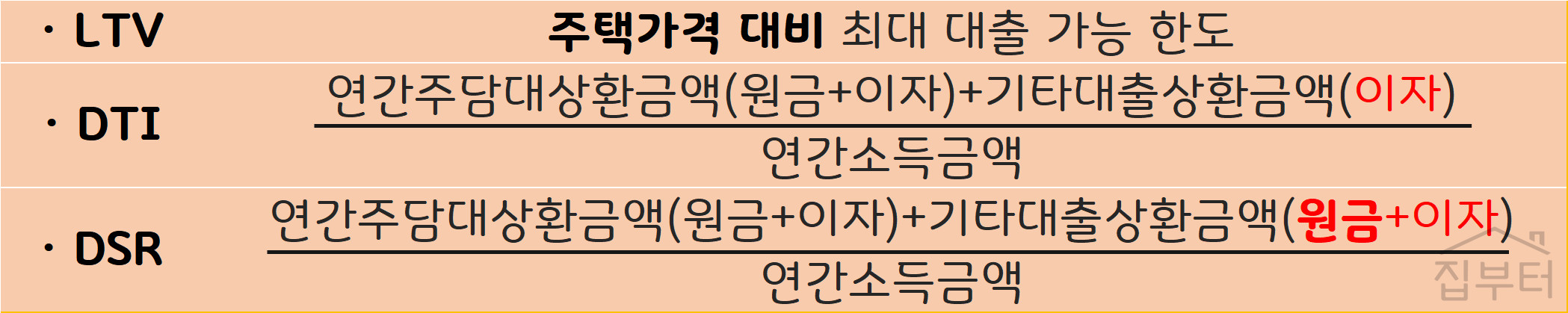 총부채상환비율입니다. 소득을 대출에 다 쓰면 위험하기 때문에 일정비율까지만 대출한도를 정해놓습니다. 계산 방법은 <연간주담대상환금액(원금+이자)+기타대출상환금액(이자)/연소득금액>입니다.