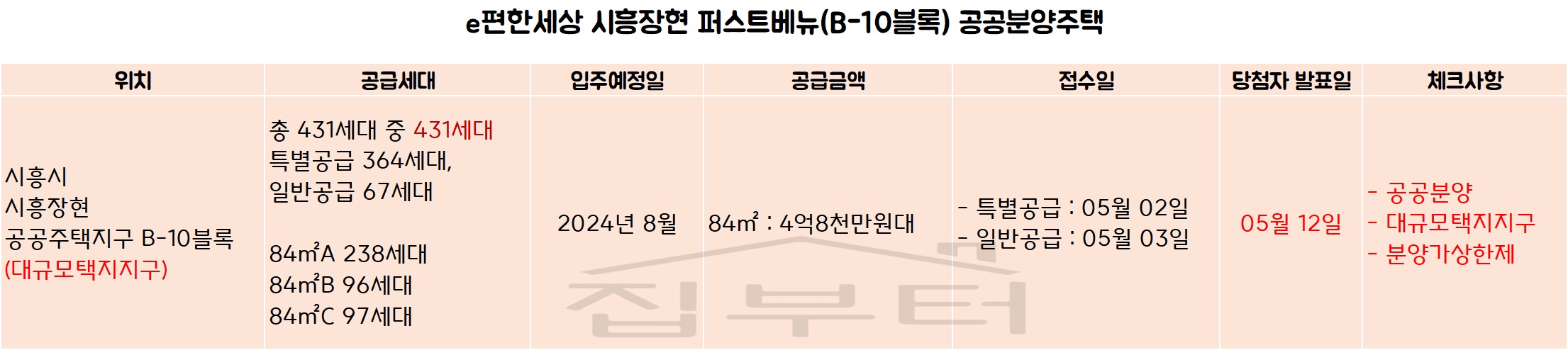 시흥시 시흥장현 공공주택지구에 공급합니다. 민간참여공공분양으로 일반적인 민간분양과 다르게 소득이나 자산을 충족해야 하는 유형도 있으니 공고문을 꼭 확인하세요!