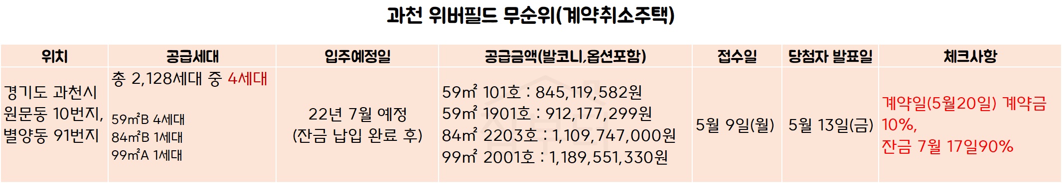 오늘은 부동산에 관심이 있으시거나 청약을 준비하시는 분들이라면 알고 계실 과천 위버필드 계약취소주택에 대해 알아보겠습니다. 이미 입주한 아파트로 이번에 불법전매나 공급질서 교란 등으로 계약취소된 주택을 사업주체가 취득하여 재공급하는 무순위(계약취소분) 공급입니다.