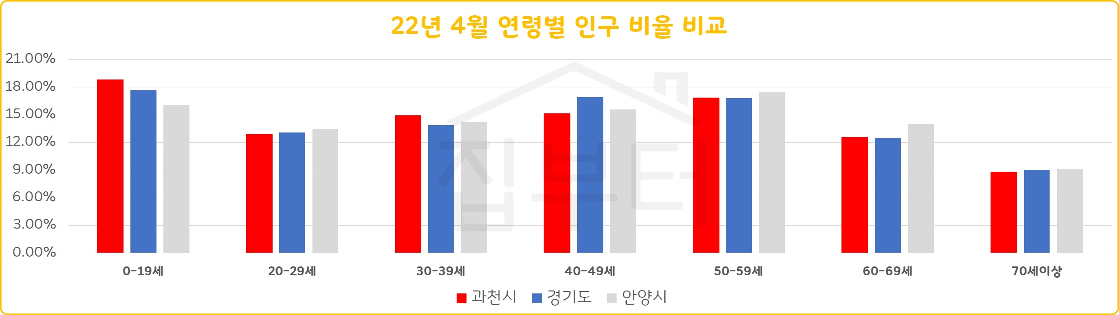 과천에 대해 알아보면서 과천은 연령층이 높은 도시라는 글들을 봤는데 22년 현재 연령별 분포를 보면 타도시와 비슷한 분포를 보였습니다. 청약 시점으로 특별공급 같은 경우는 30~40대가 많이 지원을 해서 30~40대의 비율을 보고 싶었습니다. 경기도와 과천과 붙어 있는 안양을 같이 비교했는데, 과천이 다른 지역보다 30대의 비율이 높은 점을 볼 수 있습니다. 지정타가 아직 입주를 많이 하지 않았는데, 지정타가 입주를 하면 30~40대의 비율이 더 높아질 거 같습니다. 비율로 보면 타지역과 큰 차이를 보이지 않지만 청약을 준비하는 연령대 인구대비 공급 양은 타지역보다 높을 것입니다. 최근 주암 신혼희망타운에서도 미달이 나왔는데, 다른 이유들도 있겠지만 이 인구대비 공급관점에 대한 제 생각을 주암지구를 알아보면서 다시 이야기해보겠습니다.